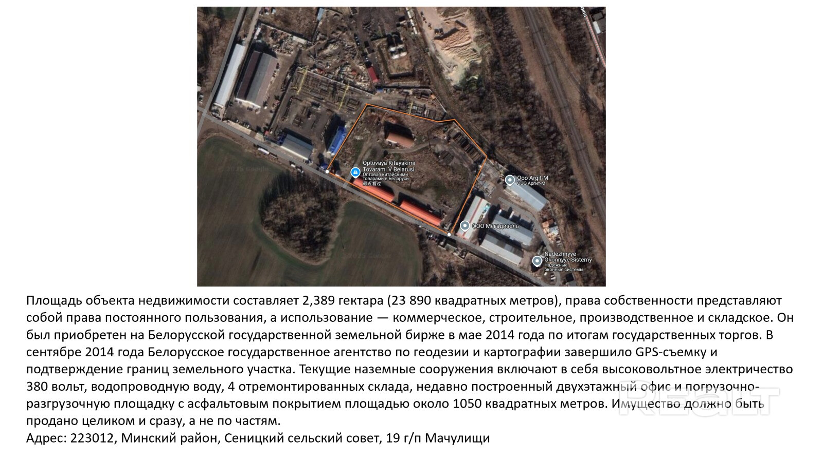 Площадь объекта недвижимости составляет 2,389 гектара (23 890 квадратных метров), права собственности представляют собой права постоянного пользования, а использование — коммерческое, строительное, производственное и складское. Он был приобретен на Белорусской государственной земельной бирже в мае 2014 года по итогам государственных торгов. В сентябре 2014 года Белорусское государственное агентство по геодезии и картографии завершило GPS-съемку и подтверждение границ земельного участка.