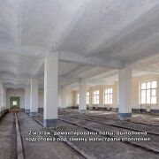 • Реновация: выполнены работы по обследованию здания, проведено часть работ по реконструкции строения – на двух этажах демонтированы полы, заменена магистраль отопления. Заменены 38 окон на современные ПВХ.
