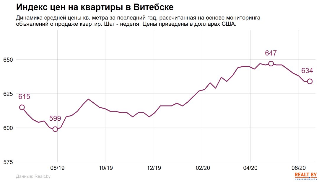Средняя цена в объявлениях о продаже квартир в Витебске не изменилась и составила 634 $/м2.