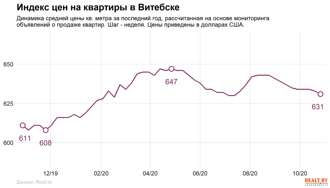 Средняя цена в объявлениях о продаже квартир в Витебске снизилась на 0.3% и составила 631 $/м2.