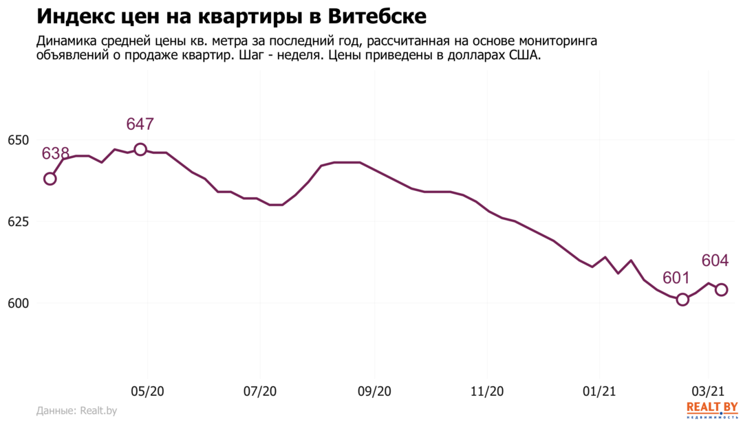 Средняя цена в объявлениях о продаже квартир в Витебске снизилась на 0.3% и составила 604 $/м2.