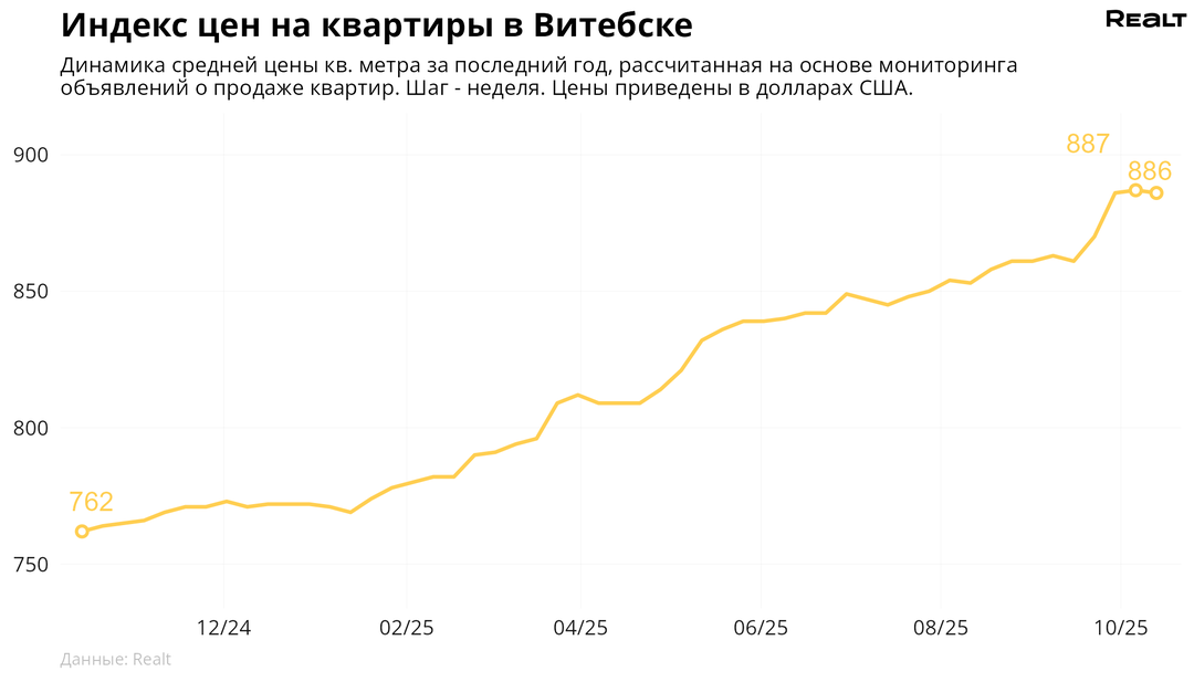 127За неделю, с 6 по 13 октября 2025 года, средняя цена в объявлениях о продаже квартир в Витебске снизилась на 0.1% и составила 886 $/м2. При этом количество квартир в продаже уменьшилось на 2.4%. Что еще произошло на рынке жилья крупнейших городов Витебской области за семь дней — в материале.