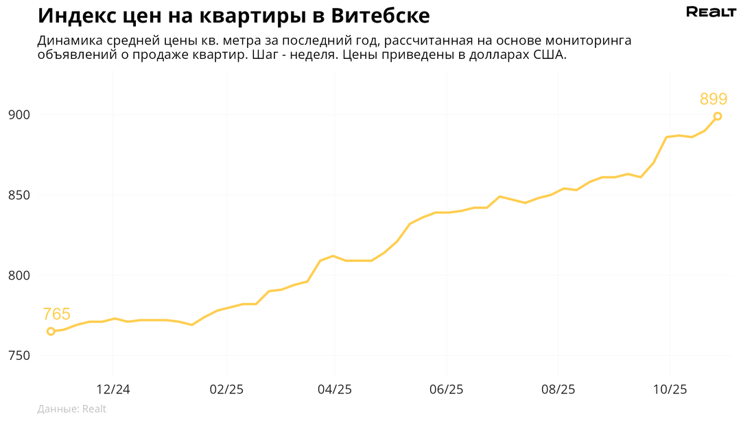 232За неделю, с 20 по 27 октября 2025 года, средняя цена в объявлениях о продаже квартир в Витебске выросла на 1% и составила 899 $/м2. При этом количество квартир в продаже уменьшилось на 1%. Что еще произошло на рынке жилья крупнейших городов Витебской области за семь дней — в материале