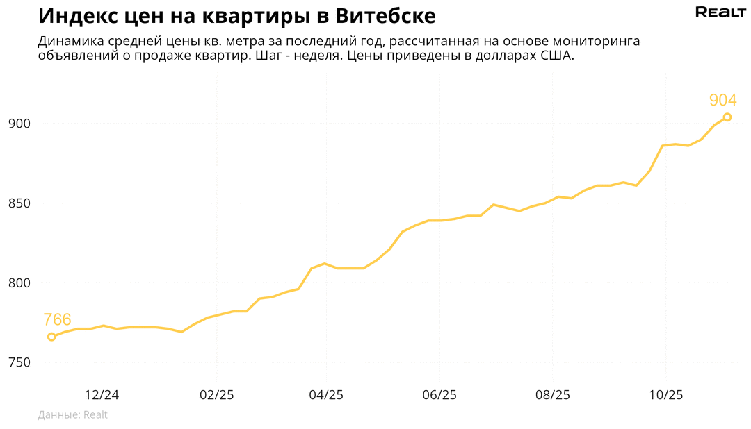 176За неделю, c 27 октября по 3 ноября 2025 года, средняя цена в объявлениях о продаже квартир в Витебске выросла на 0.6% и составила 904 $/м2. При этом количество квартир в продаже уменьшилось на 1.2%. Что еще произошло на рынке жилья крупнейших городов Витебской области за семь дней — в материале.