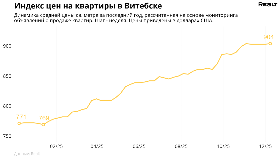 196За неделю, с 1 по 8 декабря 2025 года, средняя цена в объявлениях о продаже квартир в Витебске выросла на 0.1% и составила 904 $/м2. При этом количество квартир в продаже увеличилось на 3.8%. Что еще произошло на рынке жилья крупнейших городов Витебской области за семь дней — в материале.