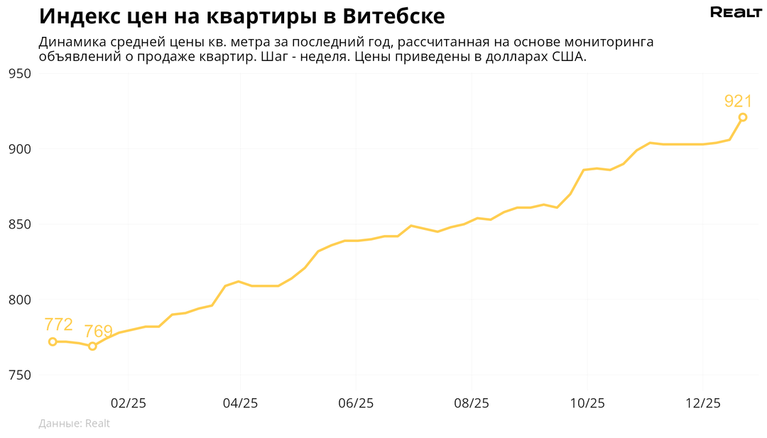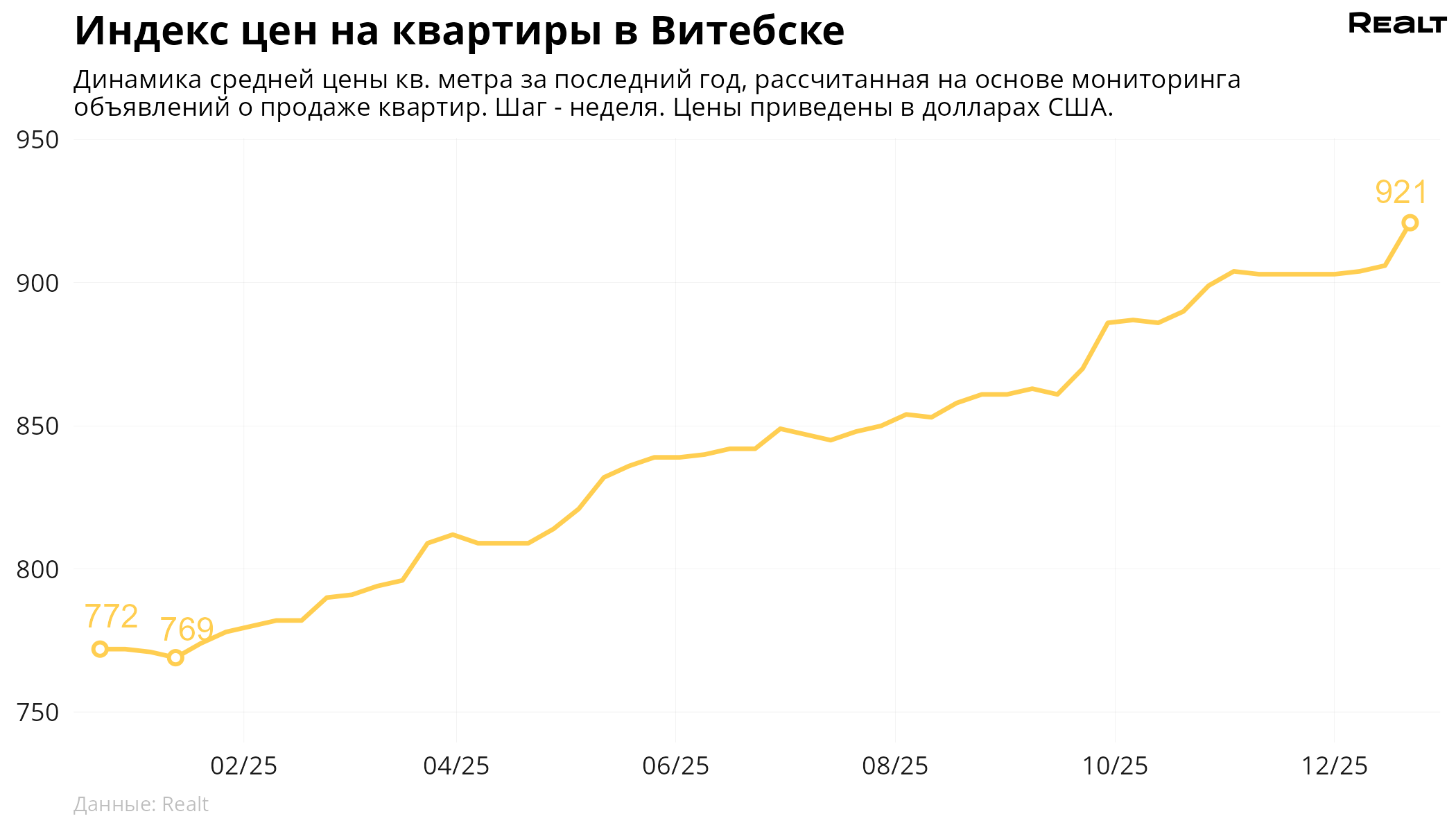 80За неделю, с 15 по 22 декабря 2025 года, средняя цена в объявлениях о продаже квартир в Витебске выросла на 1.7% и составила 921 $/м2. При этом количество квартир в продаже увеличилось на 4.2%. Что еще произошло на рынке жилья крупнейших городов Витебской области за семь дней — в материале.