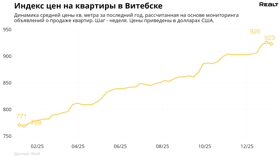 268За неделю, c 29 декабря по 5 января 2026 года, средняя цена в объявлениях о продаже квартир в Витебске снизилась на 0.3% и составила 923 $/м2. При этом количество квартир в продаже увеличилось на 1%. Что еще произошло на рынке жилья крупнейших городов Витебской области за семь дней — в материале.
