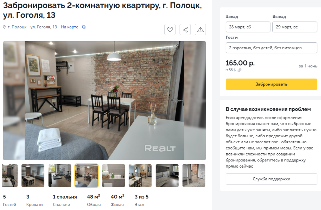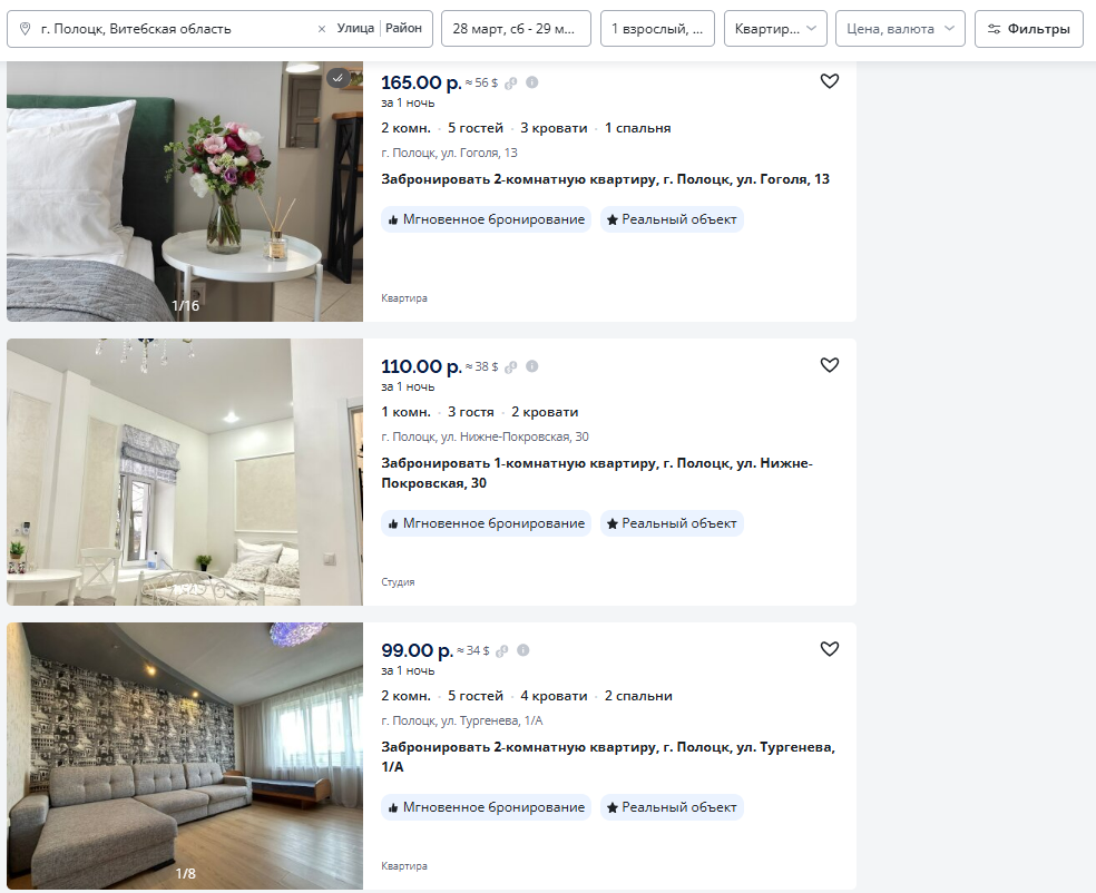 Мы просто вписали в сервисе Realt.Бронь желаемые даты (28−29 марта) для заселения в Полоцке и получили несколько десятков квартир на выбор. Конкретно эта квартира привлекла нас симпатичной обстановкой и близостью ко всем основным музеям, кафешкам и автовокзалу. Сутки на двоих в такой квартире на выбранную нами дату стоят 165 рублей (около 56 долларов).