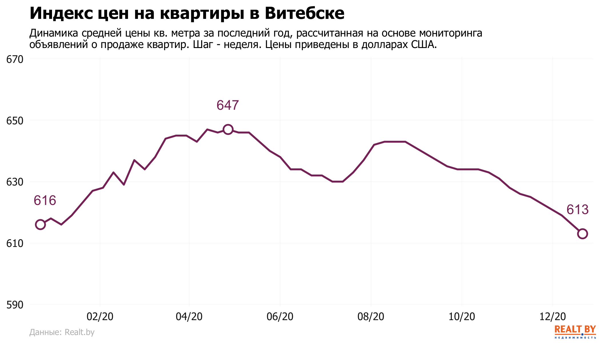 Средняя цена в объявлениях о продаже квартир в Витебске снизилась на 0.5% и составила 613 $/м2.