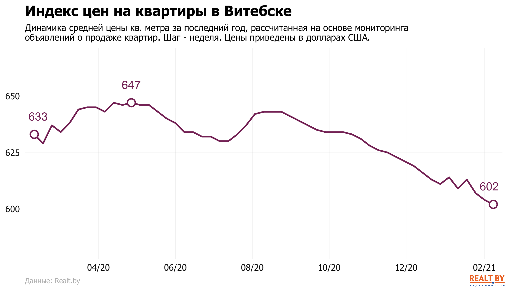 Средняя цена в объявлениях о продаже квартир в Витебске снизилась на 0.3% и составила 602 $/м2.