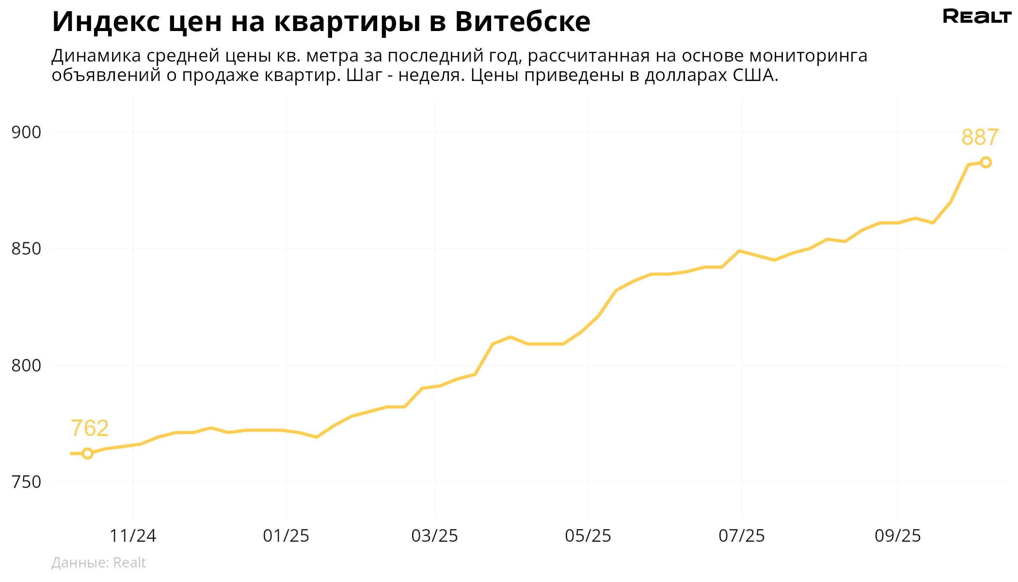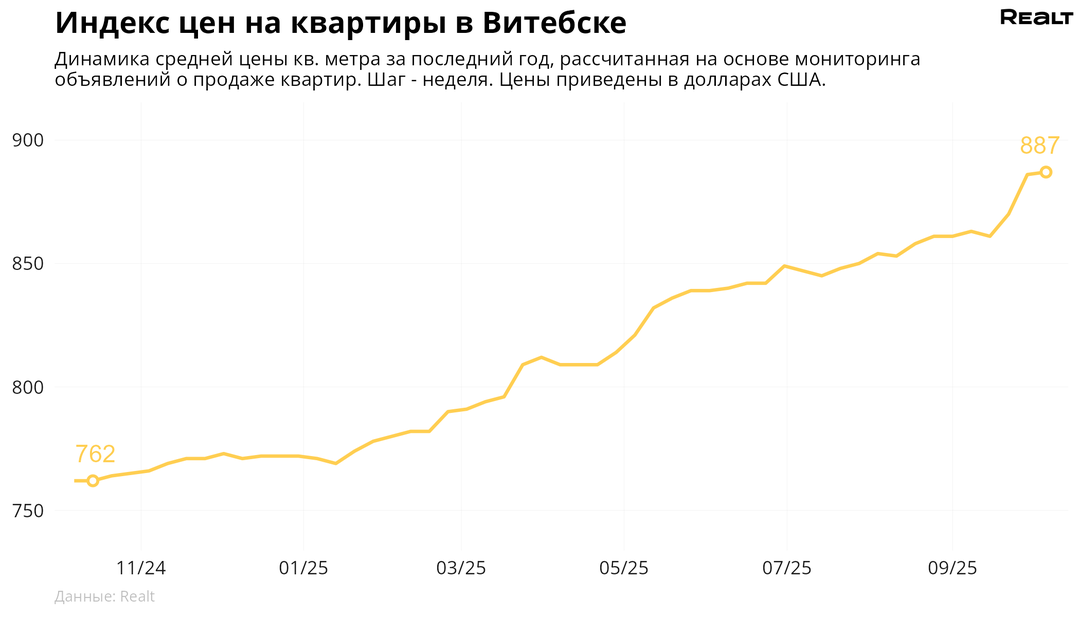 103За неделю, c 29 сентября по 6 октября 2025 года, средняя цена в объявлениях о продаже квартир в Витебске выросла на 0.1% и составила 887 $/м2. При этом количество квартир в продаже уменьшилось на 1.3%. Что еще произошло на рынке жилья крупнейших городов Витебской области за семь дней — в материале.