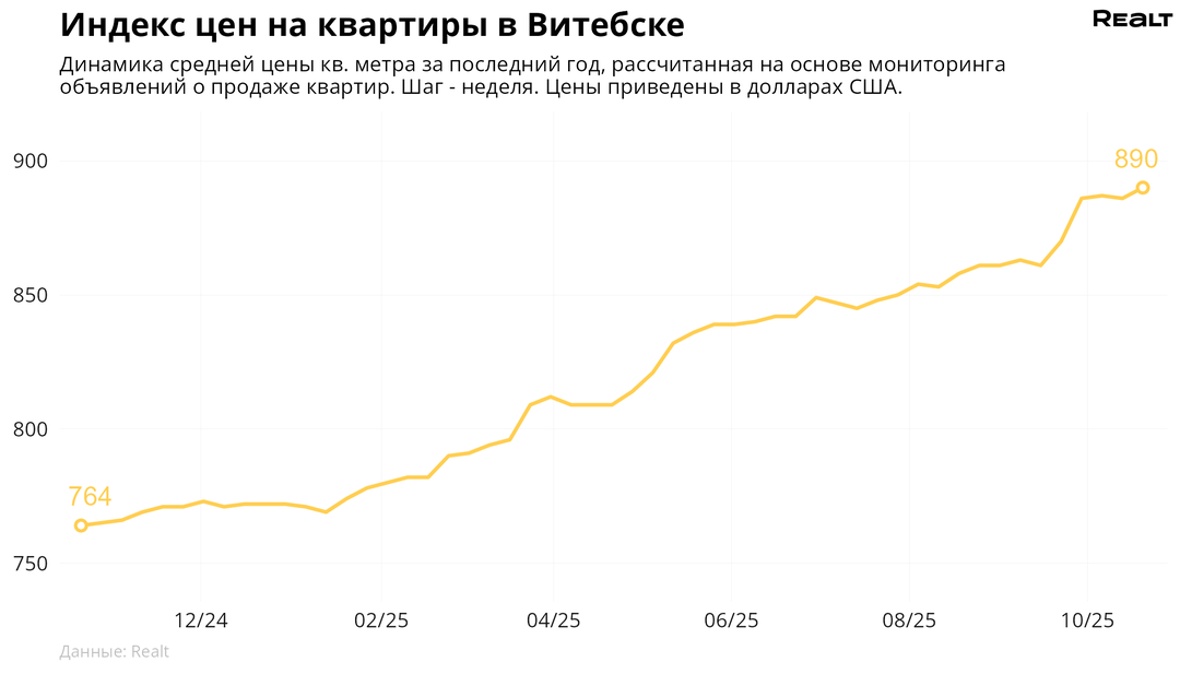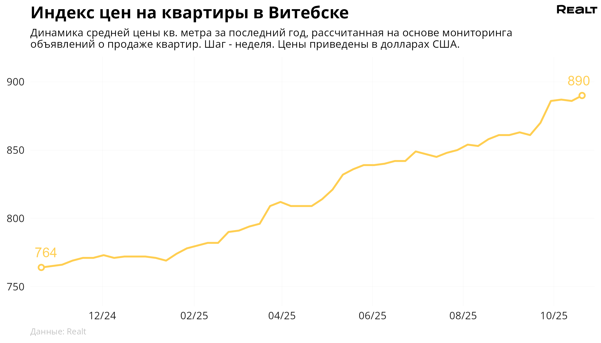 83За неделю, с 13 по 20 октября 2025 года, средняя цена в объявлениях о продаже квартир в Витебске выросла на 0.5% и составила 890 $/м2. При этом количество квартир в продаже уменьшилось на 5.5%. Что еще произошло на рынке жилья крупнейших городов Витебской области за семь дней — в материале.
