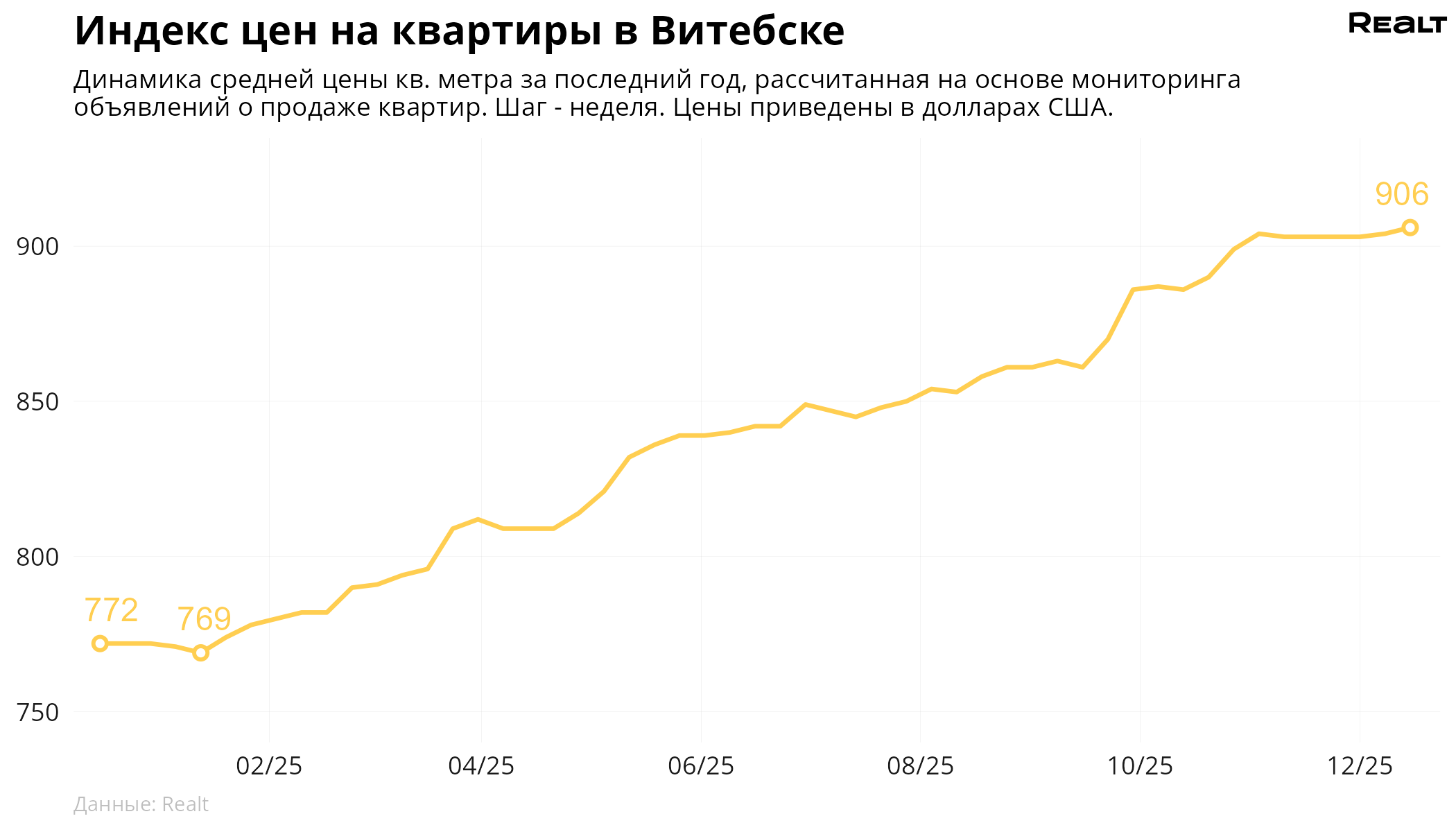 139За неделю, с 8 по 15 декабря 2025 года, средняя цена в объявлениях о продаже квартир в Витебске выросла на 0.2% и составила 906 $/м2. При этом количество квартир в продаже уменьшилось на 0.8%. Что еще произошло на рынке жилья крупнейших городов Витебской области за семь дней — в материале.