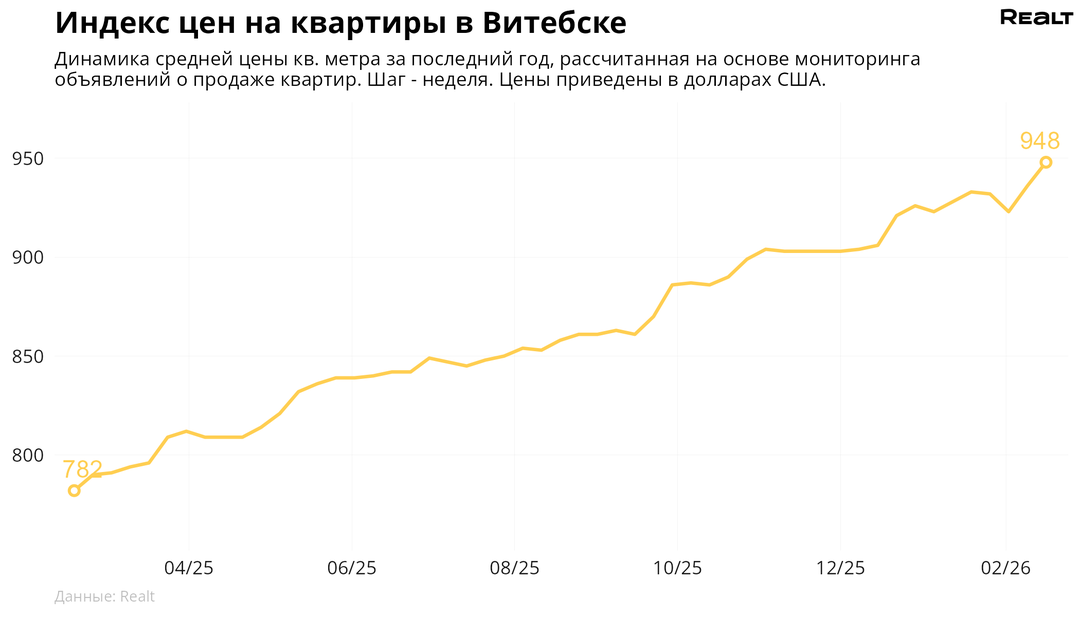 122За неделю, с 9 по 16 февраля 2026 года, средняя цена в объявлениях о продаже квартир в Витебске выросла на 1.3% и составила 948 $/м2. При этом количество квартир в продаже увеличилось на 1%. Что еще произошло на рынке жилья крупнейших городов Витебской области за семь дней — в материале.