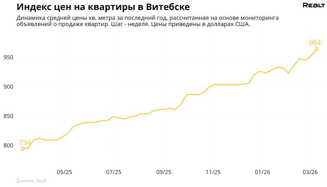 158За неделю, с 2 по 9 марта 2026 года, средняя цена в объявлениях о продаже квартир в Витебске выросла на 1.3% и составила 964 $/м2. При этом количество квартир в продаже уменьшилось на 3.9%. Что еще произошло на рынке жилья крупнейших городов Витебской области за семь дней — в материале.