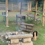 - Зона барбекю под ключ и под навесом: мангал, казан, решётки, шампуры, дрова, вода