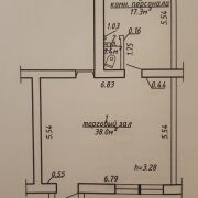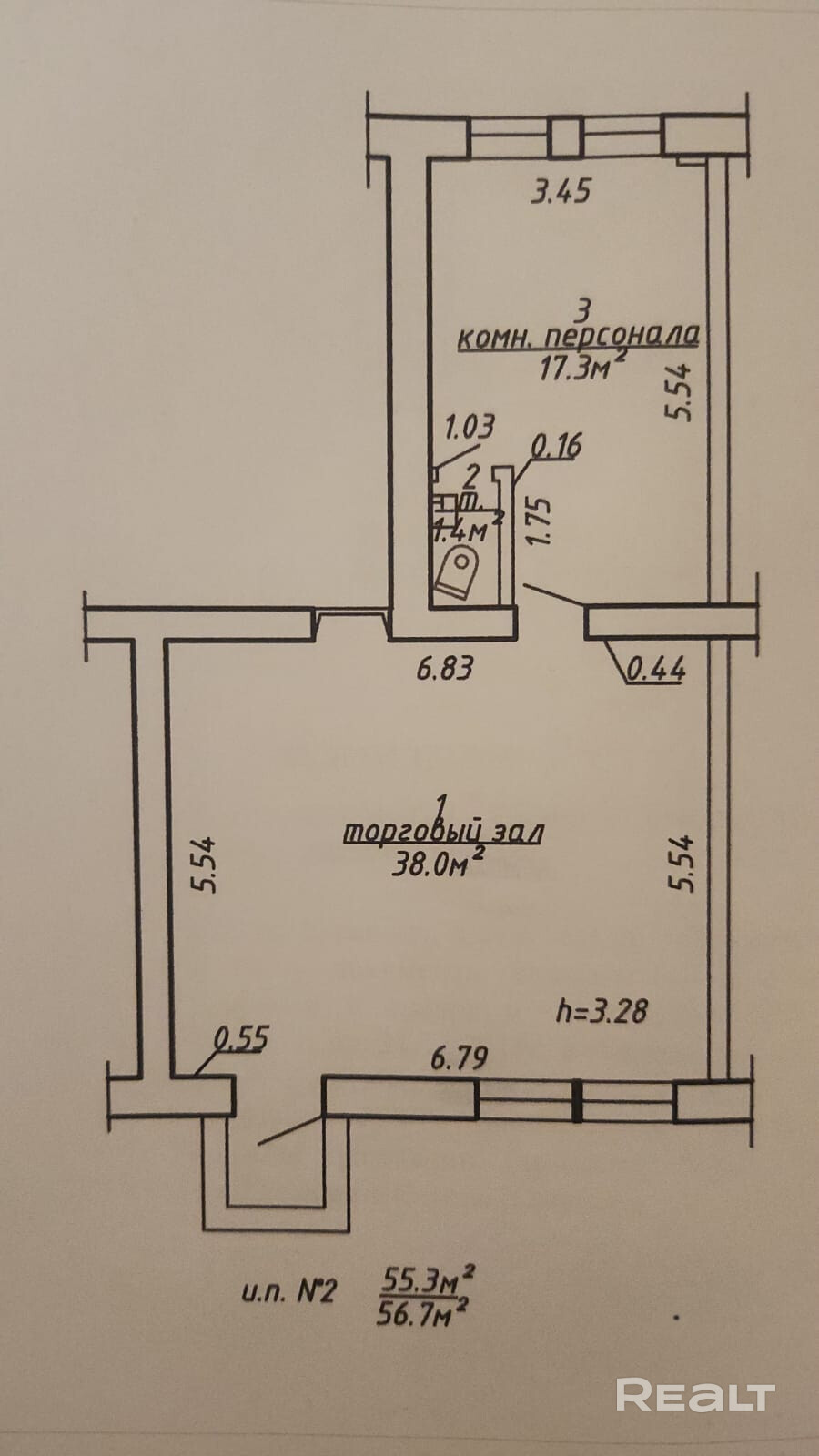 Удобная планировка: Основной торговый зал (38 м2) правильной формы + комната персонала/склад (17,3 м2) + санузел.