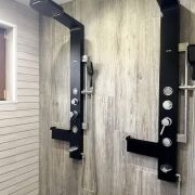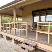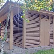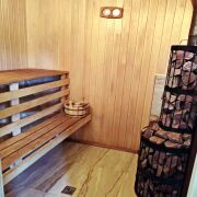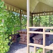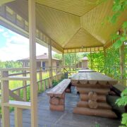 На участке также расположена баня (площадь: 36 квадратных метра)  из клееного бруса с парилкой, гостевой комнатой, туалетом и душем. Рядом расположена просторная беседка  на большую компанию, мангал, есть собственная коптильня, деревянная "дровница".
