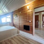 Общая площадь дома 174 квадратных метра: на первом этаже просторный холл-гостиная, кухня, две жилые комнаты, санузел с душевой кабиной. На втором уровне - три жилые комнаты, в двух есть выход на балкон. "Сердцем" дома является большая печь-камин норвежской фирмы Jotul с дозжигом углекислого газа и разводкой воздуховодов по всему дому. Камины этого производителя имеют очень высокую теплоотдачу и непревзойденную надежность. Вода в доме из собственной скважины, также есть колодец. Подогрев воды осуществляется двумя бойлерами на 100 литров, есть стиральная машина.  Канализация местная, два переливных колодца. Внутренняя  отделка дома - доска блок-хаус, на полу ламинат, в санузлах - кафельная плитка. Окна - качественные трехкамерные стеклопакеты. В доме есть несколько кондиционеров MITSUBISHI, спутниковое TV,  вай-фай интернет. Встроенная кухня с газовой плитой (баллон), вытяжкой, холодильником и микроволновкой.