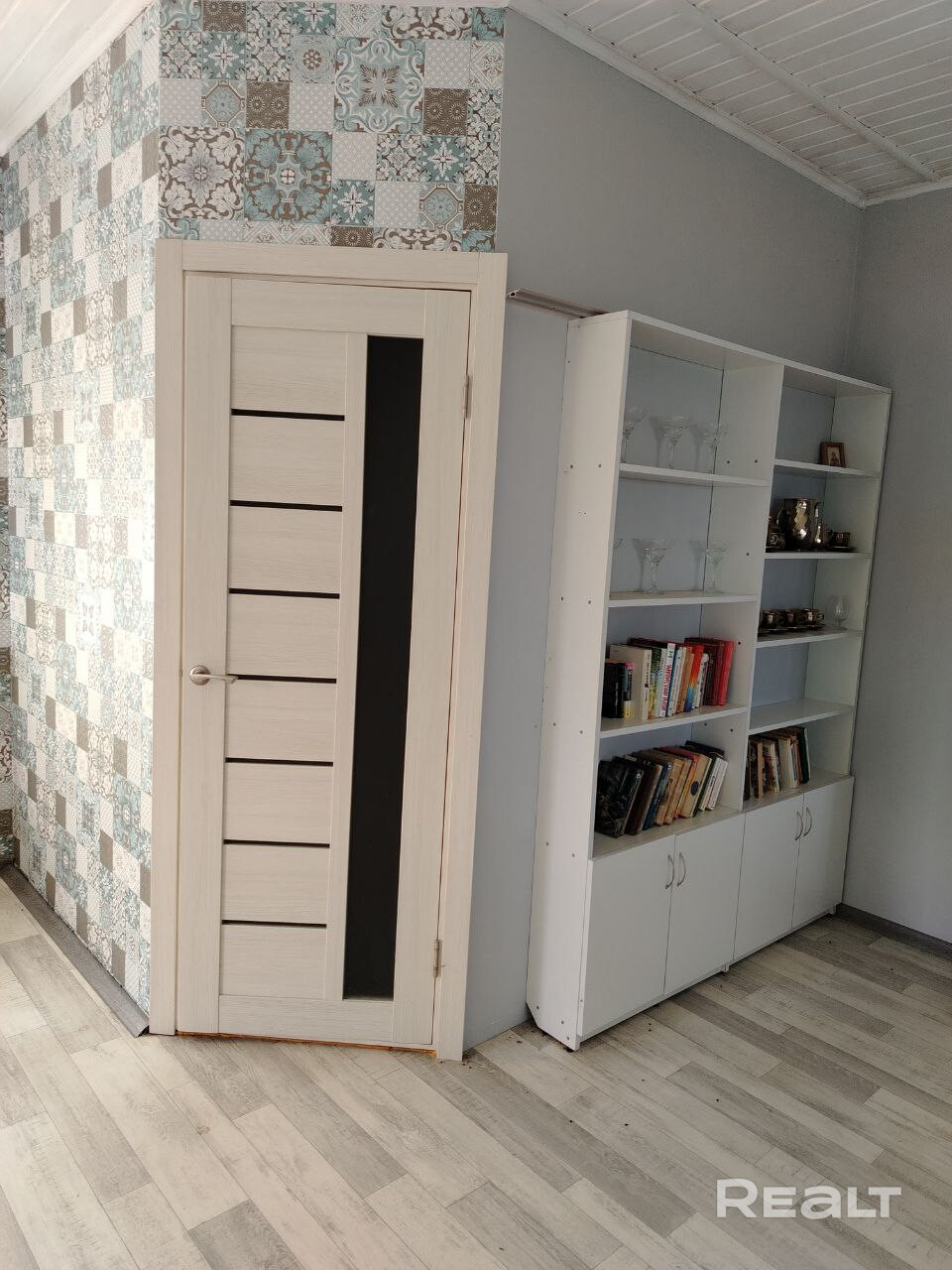 Летнюю кухню общая площадь 56 м. кв можно использовать как жилой дом, так как она обладает всеми необходимыми характеристиками и коммуникациями: стены керамзитобетон, утепление снаружи пеноплекс 6 см, изнутри штукатурка по сетке, обои. На полу стяжка, утепленная пеноплексом, линолеум, есть залитый и облицованный подиум под камин длительного горения. Панорамные окна, через которые открывается шикарный вид на Нарушевское озеро (расположено 200 метров от участка).
