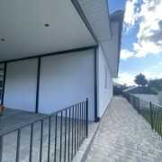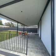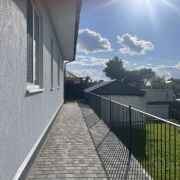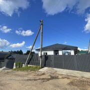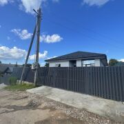Участок прямоугольной формы, засеян газоном и огорожен забором из металлопрофиля с откатными воротами.