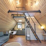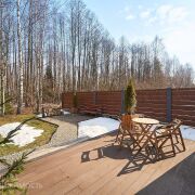 Посеян газон. Сделано уличное освещение из ретро-лампочек как на доме, так и по периметру участка. Дома полностью одинаковые. По 50 м2. Зонированы друг от друга красивыми заборами.