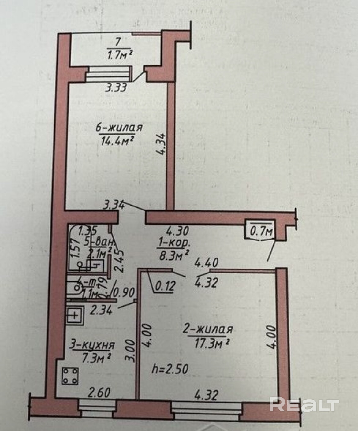 Общая площадь квартиры 51.2 м2, жилая 31.7 м2, кухня 7.3 м2.