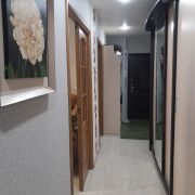 В квартире сдеан хороший ремонт. Установлены окна ПВХ. Санузел облицован плиткой. Пол - ламинат. Натяжные потолки. Установлены межкомнатные двери из массива. Входная дверь - металлическая. В прихожей остаются два шкафа - купе. Дом расположен в тихом зеленом районе (за Южным рынком). Магазины шаговой доступности, детсады, гимназия № 8, хорошее транспортное сообщение.