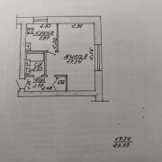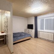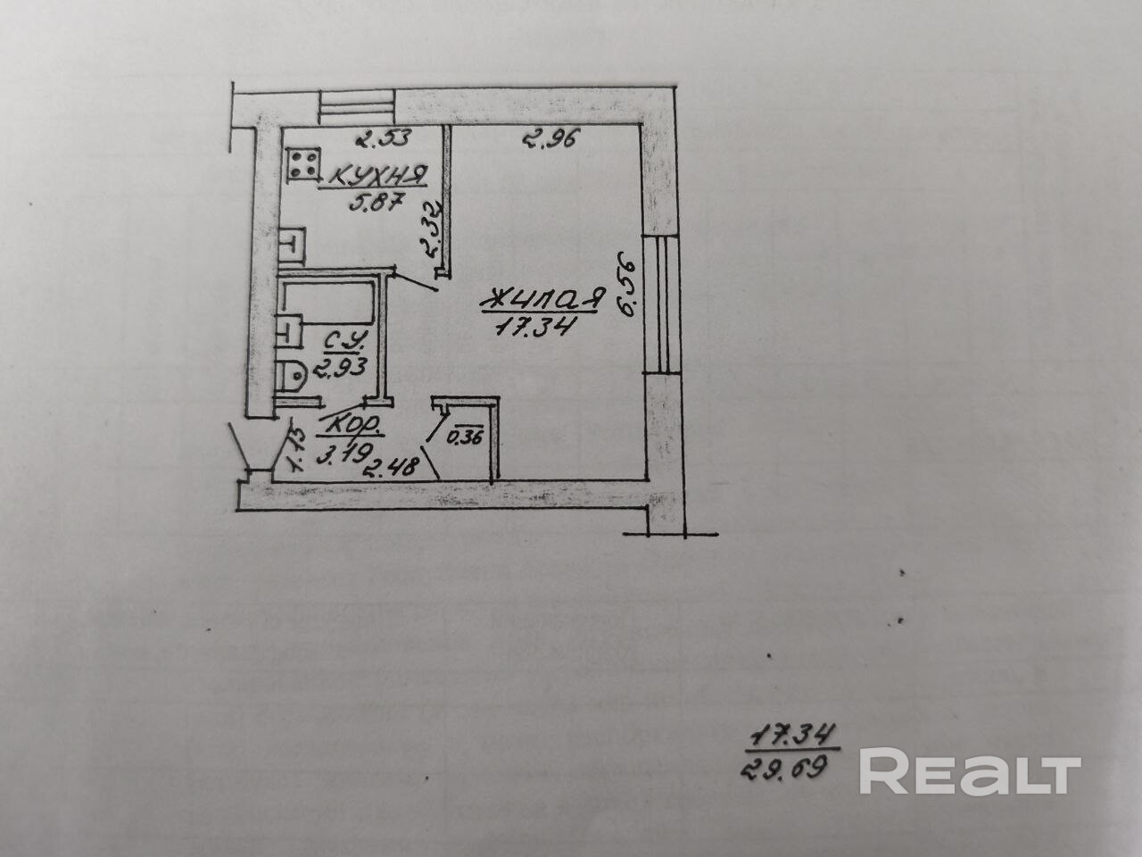 Общая площадь квартиры 29,7 М2. Жилая комната 17,3 М2, за счёт того что квартира уголовная, удобное расположение комнаты, можно разделить комнату на гостевую и спальную зоны. Кухня 5,8 М2, кухонный гарнитур остаётся в стоимость квартиры. Во всей квартиры окна ПВХ, пол ДСП, на него уложен ламинат в один цвет.