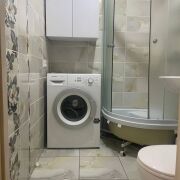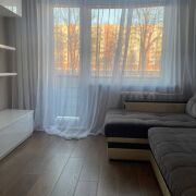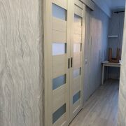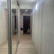 Полы – ламинат на стяжке по всей квартире. Стены выровнены, оклеены обоями. Новая электрика. Выведены точечные светильники. Потолки – натяжные. В санузле новая сантехника. Остается мебель: большой шкаф-купе в прихожей, шкаф в спальне, модульная мебель в гостиной и встроенная кухня со всей бытовой техникой — заходи и живи! Дом после капитального ремонта – заменены трубы, окна, крыша, все инженерные системы и утеплен.