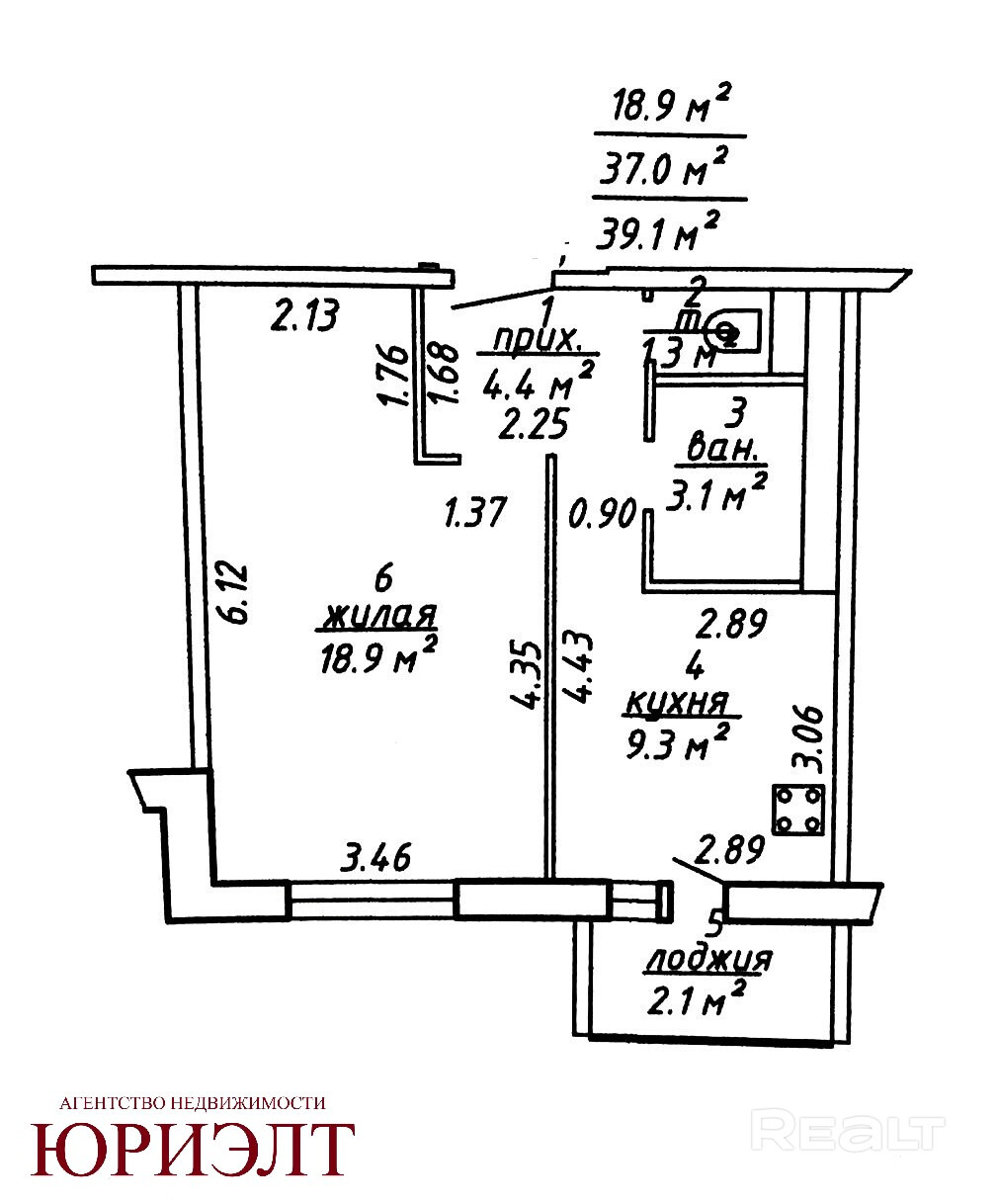 Общая площадь 39.1 м