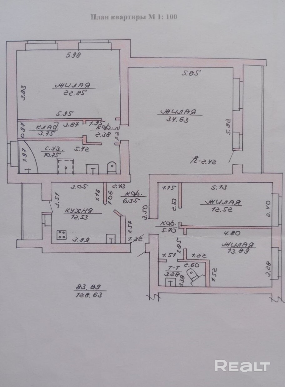 Общая площадь квартиры составляет 128,6 кв.м., жилая – 83,89 кв.м., кухня – 12,53 кв.м. В квартире два санузла. Есть две застекленные лоджии. Квартира в обычном, жилом состоянии. Дом находится в районе Медицинского университета, рядом остановки общественного транспорта, а также в шаговой доступности — парковая зона Витьба и центр города.