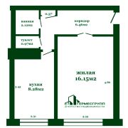 Общая площадь квартиры 34,35 м2, жилая 16,15 м2, кухня 8,28 м2.