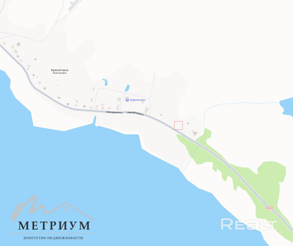 Площадь участка – 24,57 соток. Расположен в д. Красногорка, на первой береговой линии озера Снуд. На участке находится законсервированный фундамент.