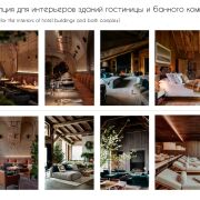 Площадь коттеджей (188,6м2; 191,1м2; 182,1м2; 180,2м2; 166,3м2), площадь ресторана 273,7 м2, площадь банного комплекса 127,1м2.