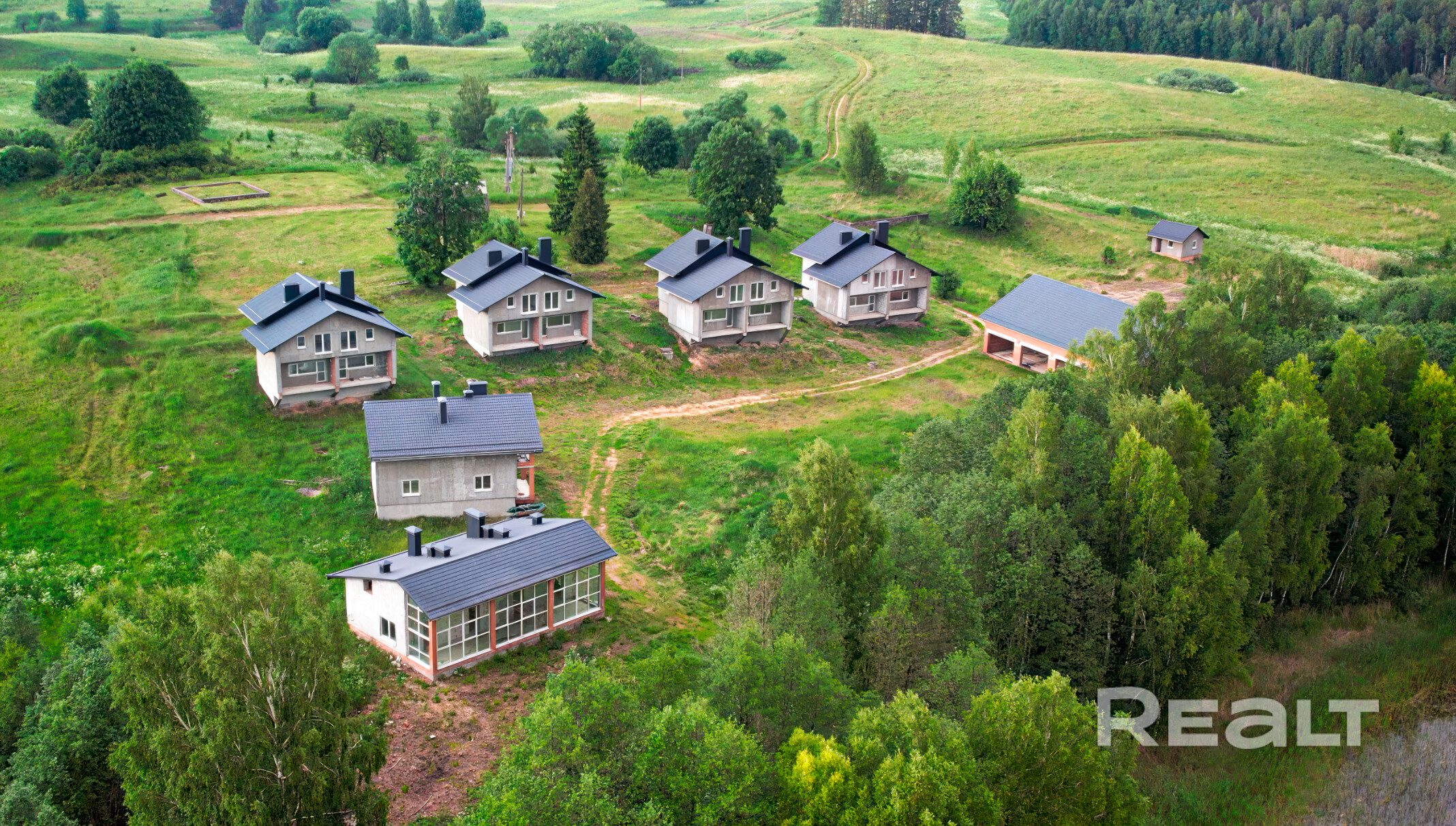 Комплекс включает в себя 5 коттеджей, ресторан и банный комплекс.